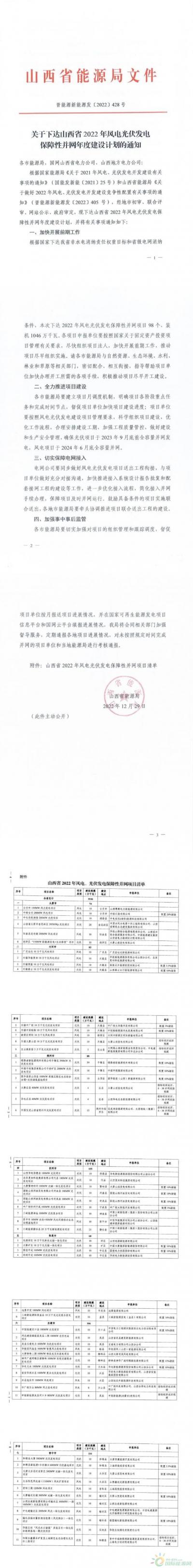 2022年12月30日,山西省能源局发布《关于下达山西省2022年风电光伏发电保障性并网年度建设计划的通知》。
