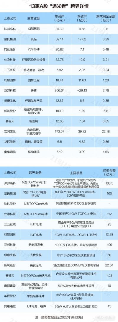 13家A股公司跨界光伏详情数据来源:公司公告、21世纪经济报道记者整理