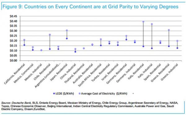 德意志银行计算19个不同电力市场,包括美国加州住宅用电、墨西哥的商业与工业用电、智利住宅用电、阿根廷住宅用电、日本住宅用电、中国工业用电、泰国住宅用电、澳洲住宅用电、南非住宅用电、土耳其住宅用电、以色列住宅用电、德国住宅与工业用电、义大利住宅与工业用电、西班牙住宅用电,以及希腊的住宅与工业用电。其太阳能电池发电的每度电均化成本(LevelizedCostofElectricity,LCOE),均已经低于市场的平均电价,也就是说,安装太阳能电池发电将可省钱。