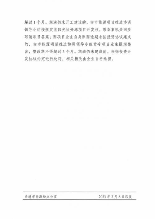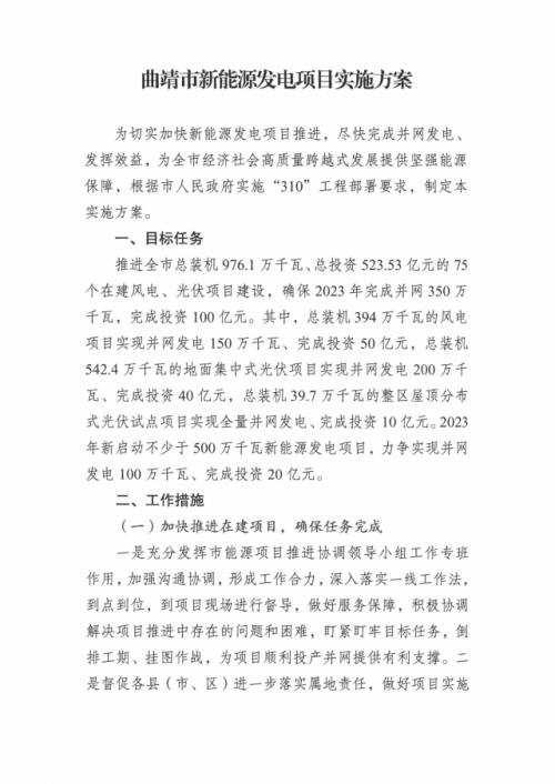 2月8日,云南曲靖市能源局印发新能源发电项目实施方案。方案明确,为切实加快新能源发电项目推进,尽快完成并网发电、发挥效益,曲靖市全力推进全市总装机976.1万千瓦、总投资523.53亿元的75个在建风电、光伏项目建设,确保2023年完成并网350万千瓦,完成投资100亿元。