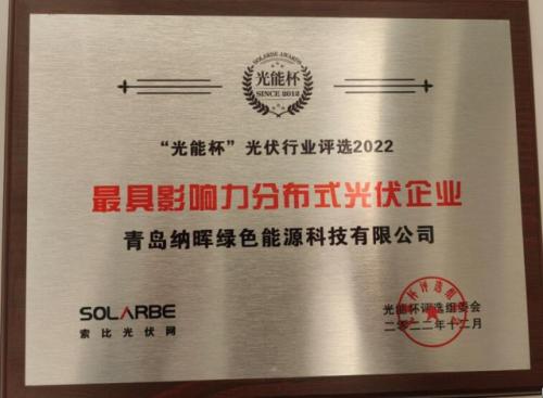 2月16日,由索比光伏网举办的2022第十届“光能杯”跨年分享会上,纳晖新能源(青岛纳晖绿色能源科技有限公司)凭借在光伏领域场景解决方案能力及良好的用户口碑,斩获了“2022年最具影响力分布式光伏企业”奖项。