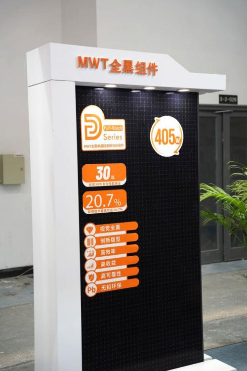 本次展品中还包括了D系全黑组件,组件正面无主栅线无焊带的设计实现视觉全黑,外观大气雅致,受到工商业及户用高端市场的认可。