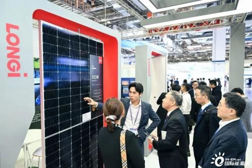 作为一家“以光为本”的能源科技公司,隆基高举“最值得信赖、最可靠的太阳能公司,开拓绿色技术之路”的理念,一炮而红。随后又展出了基于革命性HPBC电池技术打造的新一代光伏组件——Hi-MO 6,引得众多来宾驻足围观。Hi-MO 6是隆基面向全球分布式用户“量身定制”的首款专属组件,产品量产最高效率22.8%,实现了光伏组件“美效双收”的全面升级。得益于开创性正面无栅线技术,Hi-MO 6重新定义了光伏产品的美学理念,简化、纯粹、极致,全屏镜面浑然天成,能与各类应用场景自然和谐匹配。