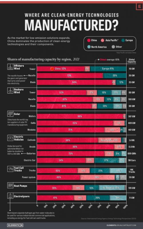 当我们审视清洁能源技术及其组件的制造地时,有一点非常清楚:中国占据主导地位。