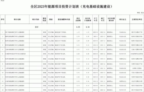 加快充电设施建设。2023年计划完成投资4.24亿元,以全区14个设区市为单位开展项目实施,加快推进充电桩建设,14个设区市新能源汽车充电桩2023年度建设任务数以《广西壮族自治区人民政府办公厅关于转发自治区发展改革委广西新能源汽车推广应用三年行动计划的通知》(桂政办函〔2021〕7号)统筹下达的任务数为目标。