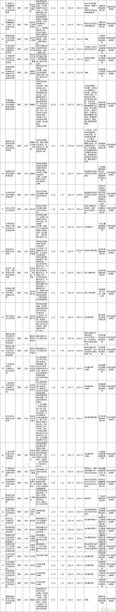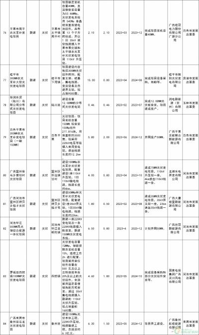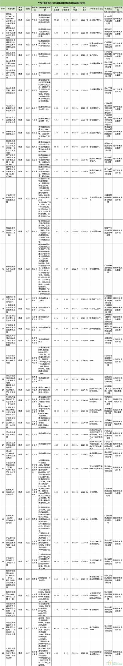 《通知》指出,2023年围绕广西“十四五”能源发展规划实施,以输配电、核电、火电及煤电机组灵活性改造、储能、光伏发电、风电、水电、油气及煤炭储运、充电基础设施和综合供能服务站等建设为重点,统筹推进输配电、电源、储能、油气及煤炭储运、充电设施等五大类项目建设,确保完成年度投资750亿元。其中光伏项目84个,项目总投资746.94亿元,2023年计划投资109.68亿元!