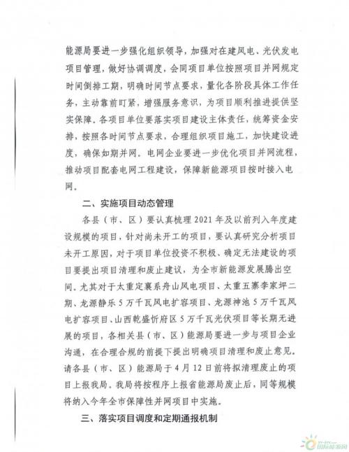 《通知》指出,实施项目动态管理。各县(市、区)要认真梳理2021年及以前列入年度建设规模的项目,针对尚未开工的项目,要认真研究分析项目未开工原因,对于项目单位投资不积极、确定无法建设的项目要提出项目清理和废止建议,为全市新能源发展腾出空间。尤其对于太重定襄系舟山风电项目、太重五寨李家坪二期、龙源静乐5万千瓦风电扩容项目、龙源神池5万千瓦风电扩容项目、山西乾盛忻府区5万千瓦光伏项目等长期无进展的项目,各相关县(市、区)能源局要进一步与项目企业沟通,在合理合规的前提下提出明确项目清理和废止意见请各县(市、区)能源局于4月12日前将拟清理废止的项目上报忻州市能源局。忻州市能源局将按程序上报省能源局废止后,同等规模将纳入今年全市保障性并网项目中实施。