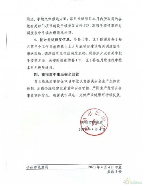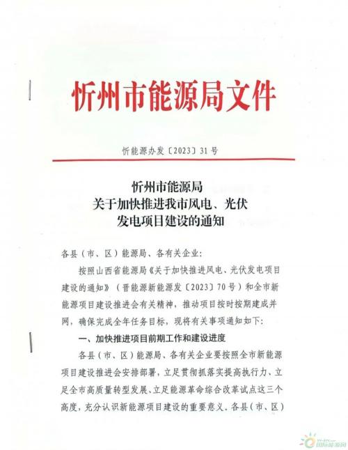 4月6日,山西忻州市能源局发布《关于加快推进忻州市风电、光伏发电项目建设的通知》。