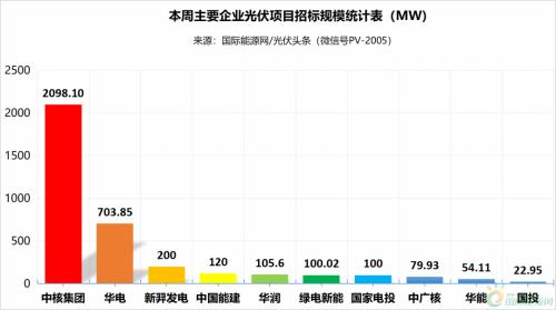 具体到本周的招标市场,中核集团以2098.10MW排名第一。华电则以703.85MW位居第二。承德县新羿发电有限公司以容量200MW,排名本周第三。