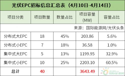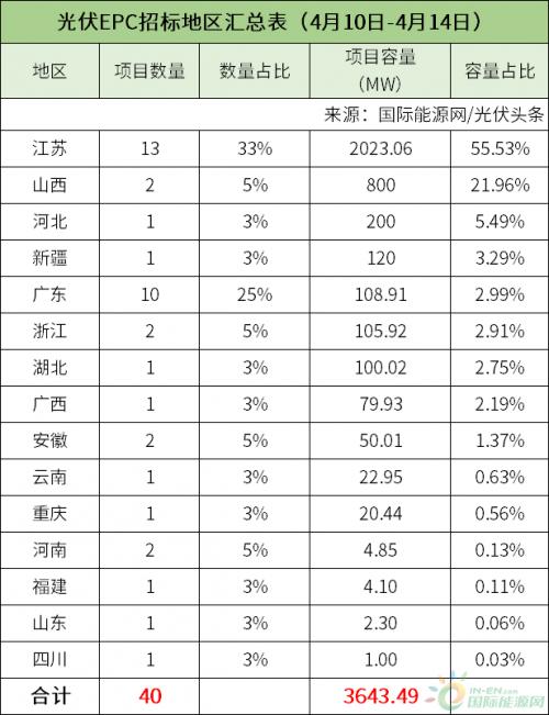 本周中核集团、华电等企业发布了40个光伏招标项目,装机规模合计3643.49MW。