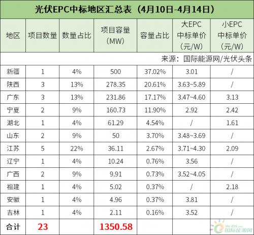 本周中标项目位于新疆、陕西、广东等12省。其中新疆以500MW排名第一,陕西以278.35MW位列第二,广东以231.86MW位居第三。
