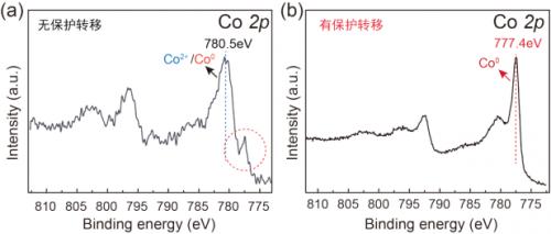 (a)样品在无保护状态下测得的Co2p谱图,(b)样品在保护转移状态下测得的Co 2p谱图
