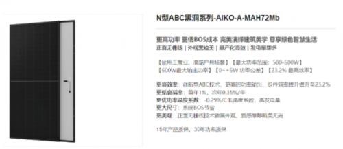 ▲ABC是IBC电池结构的一种,爱旭股份ABC电池的目前量产平均转换效率已接近26.5%,图为爱旭股份2022年推出的一类ABC电池组件产品