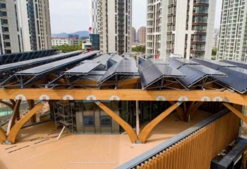 这处人才公寓项目位于中央商务区的吉庆路旁,11栋楼错落有致地矗立在那里。项目社区服务中心特别引人注目。这是一幢基于“能量山”的木质组装体,通过木结构+光伏发电系统,达到了“零能源、零碳”的目的。