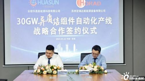 2023年5月22日,苏州宏瑞达新能源装备有限公司(以下简称“宏瑞达”)与异质结龙头安徽华晟新能源科技有限公司(以下简称“华晟新能源”)在异质结之都安徽宣城再度牵手,共同签署战略合作协议,结成深度战略合作伙伴关系,达成战略合作意向。
