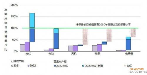 在2050年净零排放目标情景(NZE)下,关键清洁能源技术的宣布项目2030年产能和部署情况。2022年底指截至2022年11月底,2023年Q1新增指2022年11月底至2023年3月底,下同。(来源:IEA)