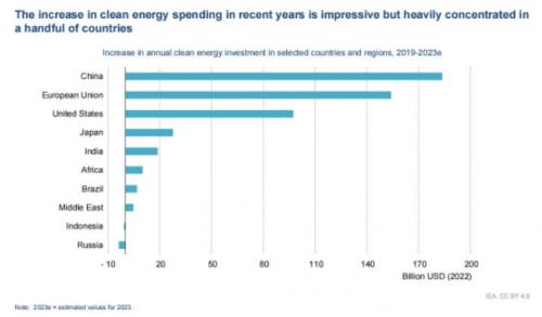 IEA称,化石能源每投入1美元,就有约1.7美元投入到清洁能源。同时,在可再生能源和电动汽车的推动下,2021年至2023年期间,年度清洁能源投资预计将增长24%,而同期化石燃料投资仅增长15%。