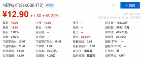 6月9日,据交易所公告,阿特斯今日在上海证券交易所科创板上市,公司证券代码为688472,发行价格11.1元/股,发行市盈率为19.42倍。截止到9:25,阿特斯开涨16.22%,报12.90元/股,总市值465.31亿元。