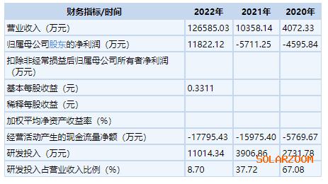 财务数据显示,2020年-2022年公司实现营业收入分别为4072.33万元、1.04亿元、12.66亿元,实现净利润分别为-4595.84万元、-5711.25万元、1.18亿元。增幅方面,2022年公司营业收入增长1122.08%,净利润同比增长307.00%。
