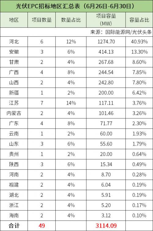 本周国家能源集团、华能、中国电建、粤水电等企业发布了49个光伏招标项目,装机规模合计3114.09MW。