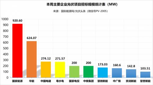具体到本周的招标市场,国家能源集团以920.60MW排名第一。华能则以624.07MW位居第二。中国电建以容量274.12MW,排名本周第三。