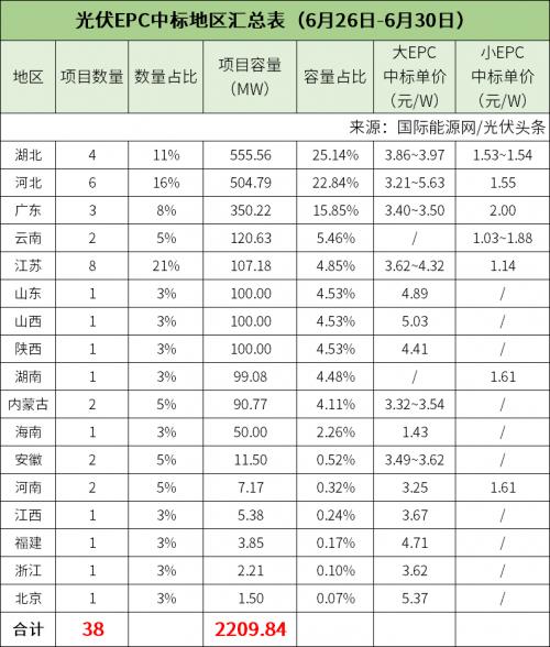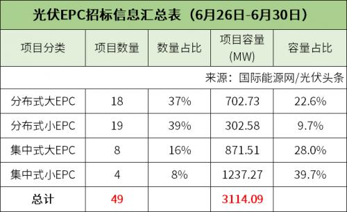 从本周招标项目类别来看,分布式光伏项目有37个,集中式光伏项目有12个,大EPC项目有26个,小EPC项目有23个。