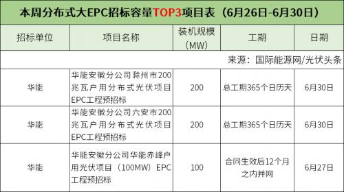 分布式大EPC项目有18个,其中招标容量最大项目为华能安徽分公司滁州市200兆瓦户用分布式光伏项目EPC工程预招标和华能安徽分公司六安市200兆瓦户用分布式光伏项目EPC工程预招标。两个项目均规划装机容量200兆瓦,分二期实施,项目采用“全额上网”模式,计划于2023年8月15日开工(暂定),总工期365个日历天。