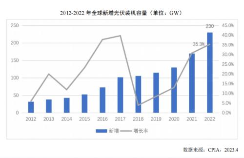 2023年,全球光伏市场需求持续保持旺盛,尽管面临疫情干扰、产业链价格波动和欧洲地缘政治紧张局势的影响,2022年全球光伏新增装机230GW,同比增长35.3%,累计装机容量约1156GW。