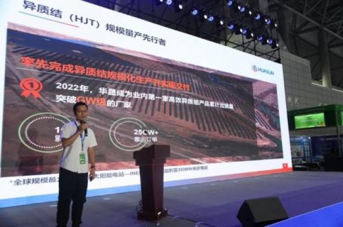 展会期间,技术研发中心主任高级工程师吴明东出席了“2023中国(合肥)光储融合创新发展论坛”,向与会人员分享了过去一年来华晟异质结组件的户外发电量实证结果。