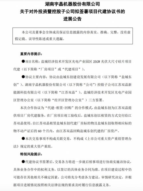 6月19日,宇晶股份(002943.SZ)公告,为加快项目推进,降低公司控股子公司江苏双晶前期对厂房建设等大额的资本投入,盐城东创、江苏双晶、经开区管理办公室三方拟签署《盐城经济技术开发区光电产业园区25GW光伏大尺寸硅片项目代建协议书》。