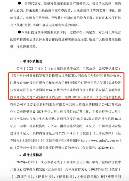4月22日,江苏双晶完成了工商注册登记手续,取得了盐城经济技术开发区行政审批局核发的《营业执照》。5月23日,江苏双晶完成25GW光伏大尺寸硅片项目的备案手续,取得了盐城经济技术开发区行政审批局核发的《江苏省投资项目备案证》(备案证号:盐开行审经备〔2022〕71号)。