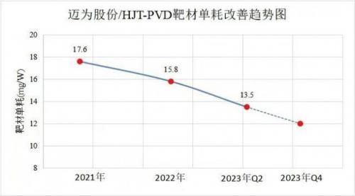 在致力优化靶材单耗的过程中,得益于对大量测试数据与改进方案的深厚积累,迈为已形成清晰、有效的单耗降低技术路径。预计在2023年末,迈为提供的异质结电池制造整体解决方案中,对于100%铟基靶材的理论单耗可降低到12mg/W左右。