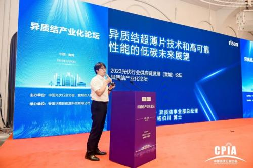 近日,由中国光伏行业协会主办的“光伏行业2023年上半年发展回顾与下半年形势展望研讨会暨2023光伏行业供应链发展(宣城)论坛”在安徽省宣城市隆重拉开帷幕。东方日升异质结事业部总经理杨伯川博士应邀出席活动,并在平行论坛--异质结产业化论坛上发表《异质结超薄片技术和高可靠性能的低碳未来展望》主题演讲,就光伏行业技术趋势、异质结技术规模化量产的有效解决路径及东方日升创新异质结组件方案展开了全面分享。