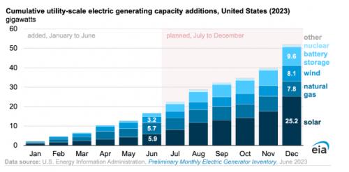 据美国能源信息署的数据, 2023年上半年美国电网新增16.8吉瓦的公用事业规模发电装机,开发商计划在今年下半年再增加35.2吉瓦的装机容量。