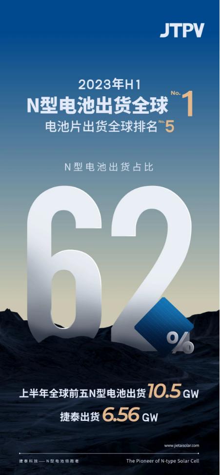 8月28日,光伏权威分析机构PV Infolink正式公布了2023上半年电池片出货排名。今年上半年前五电池厂家总出货量达到近84.4GW,相比去年上半年增长近49%,其中前五电池片厂家TOPCon电池片累计出货10.5GW左右。而捷泰科技N型TOPCon电池出货达6.56GW,占比前五厂家N型电池出货量的62.48%,成为当之无愧的全球N型出货行业第一。