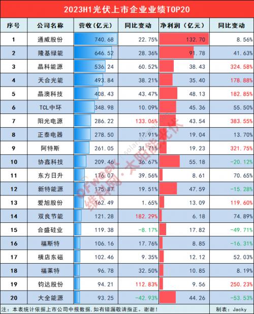 众所周知,行业发展看龙头。据笔者不完全统计,2023年上半年,国内光伏龙头上市公司(A+H股)业绩前20强的营收合计高达5457.87亿元,归母净利润合计达到707.72亿元。