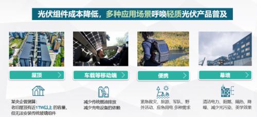 分布式光伏已连续3年市场占比超过集中式光伏,而这其中“光伏+建筑”无疑是未来最大的市场。我国存量建筑面积为100亿㎡,每年新增竣工厂房及仓库约6.5亿㎡。同时,随着光伏发电的成本持续降低,也会使其它各种场景的应用更加广泛。新应用场景井喷,对组件的轻质化、薄膜化的需求也大大提升。