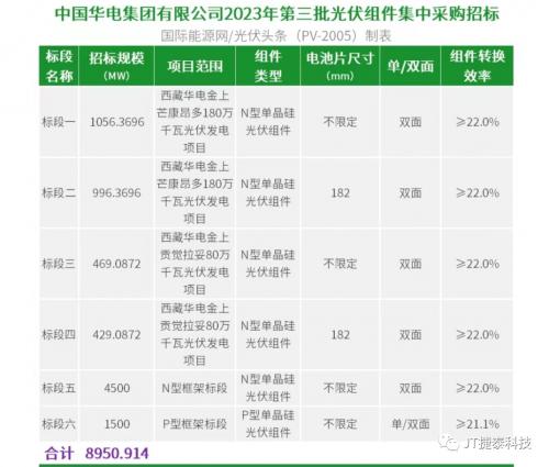 目前,N型产品市场需求旺盛,在国内光伏招标投标中市场表现良好,备受央国企青睐。除大唐集团以外,华电集团2023年8.95GW光伏组件集采招标中,N型配置7.45GW,占比高达83.2%,远超P型产品;而国家能源集团10GW集采招标项目中,N型总规模7GW,占比高达70%,较去年相比提升明显。