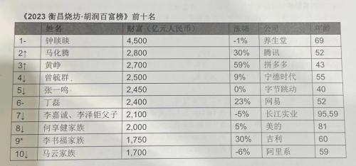 榜单显示,今年胡润百富榜前十位的上榜门槛为1700亿元,财富排名前三位的企业家分别为:钟睒睒、马化腾、黄峥。