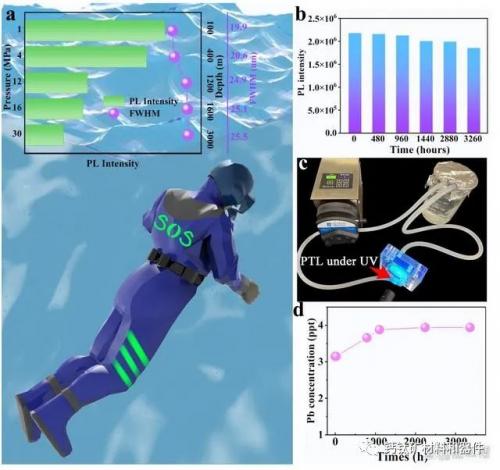 利用自制的动态水装置模拟了570 mL/ min快速流速下冲刷下PLT的真实情况,结果显示PLT可以在连续发出绿光(图2c)。电感耦合等离子体质谱仪(ICP-MS)测量结果表明,在动态水冲刷的3300小时过程中,泄露的Pb2+浓度仅仅为3.94 ppt,这低于世界卫生组织规定的安全饮用水(<0.01 ppm)的Pb2+浓度8个数量级。这种抑制铅离子泄漏的优异能力可以归因于HPβCD团簇对重金属离子的原位封装和有效的化学吸附。此外,聚合物基质和外层的PFOS物理屏障可以有效地将Pb2+离子固定在树脂/纳米硅烷复合材料上。