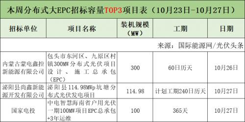 分布式大EPC项目有27个,其中招标容量最大项目为包头市东河区、九原区村镇300MW分布式光伏项目设计、施工总承包(EPC)。项目招标人为内蒙古蒙电鑫控新能源有限公司,分为三个标段,合计招标容量为300MW。