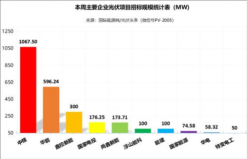 具体到本周的招标市场,中核集团以1067.5MW排名第一。华能以容量596.24MW,排名本周第二。内蒙古蒙电鑫控新能源有限公司则以300MW位居第三。