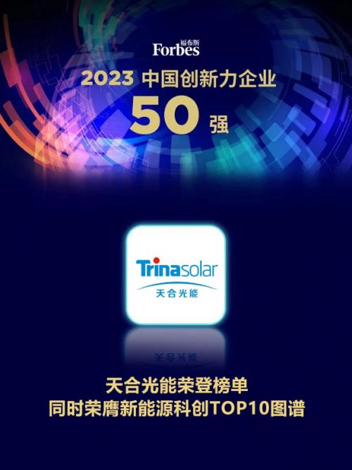 11月9日,福布斯中国正式发布“2023福布斯中国创新力企业50强”榜单,并首次推出“新能源科创TOP10图谱”。天合光能凭借在光储领域的科技创新与引领入选“2023福布斯中国创新力企业50强”榜单及新能源科创TOP10。