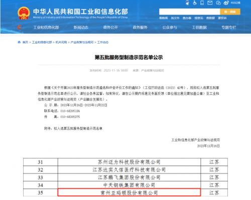 11月16日,国家工业和信息化部发布了《第五批服务型制造名单公示》。亚玛顿成功上榜,入围该名单。2021年亚玛顿入选“江苏省先进制造业和现代服务业深度融合试点单位名单”,2022年获评“江苏省服务型制造示范企业”,此次入围该名单,再一次肯定了亚玛顿整体服务型制造能力。