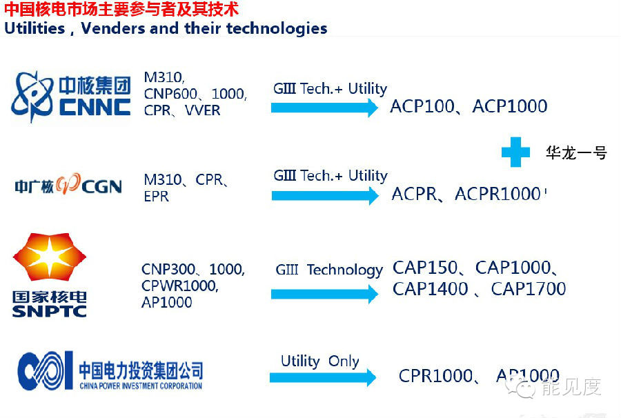中国大陆在建核电机组30台中包括二代23台,三代6台,四代原型堆1台。根据中国政府《核电中长期发展规划》,中国后续核电项目将主要采用三代AP1000及其再创新技术(超过10台采用AP1000/CAP1000和CAP1400的机组正在接受政府评估并即将获批)。相比于二代机组,非能动机组(第三代核电)无需外部应急电源,依靠重力、势能(高位水箱)、自然循环和蒸发等这些自然的现象,驱动冷却水冷却反应堆和安全壳,把热量带出去,在极端环境下的安全系数更高。虽然国家层面早已确定了以AP1000为代表的第三代核电作为未来的技术路线,但从中国机组建设情况来看,已运营机组基本上以二代技术为主。