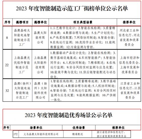 近日,工业和信息化部发布“2023年度智能制造示范工厂揭榜单位”“2023年度智能制造优秀场景”公示名单,晶澳太阳能有限公司、上海晶澳太阳能科技有限公司、晶澳(扬州)太阳能科技有限公司、义乌晶澳太阳能科技有限公司成功上榜。这是对晶澳近年来卓越的智能化、数字化制造能力、领先的技术水平以及高效的制造流程等优势的充分肯定,也标志着晶澳在光伏智能制造产业领域具备示范引领作用。