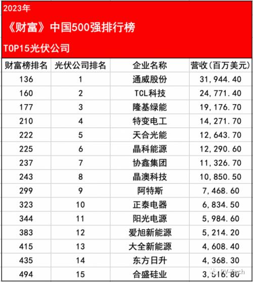其中,排名前十五的公司分别为:通威股份、TCL科技、隆基绿能、特变电工、天合光能、晶科能源、协鑫集团、晶澳太阳能、阿特斯、正泰电器、阳光电源、爱旭新能源、大全新能源、东方日升、合盛硅业。