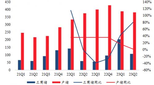 根据WoodMac数据,2023Q1-Q2,美国户储装机293.2MW/769.4MWh,同比-1.9%/+8.5%;美国工商业储能装机101.6MW/310.3MWh,同比+14.3%/+53.7%。