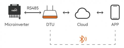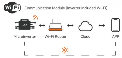 TSUN微型逆变器通过内置WiFi模块连接至路由器,将采集到的数据传输到服务器,也可通过WiFi直接连接至手机APP ,进行数据交互。