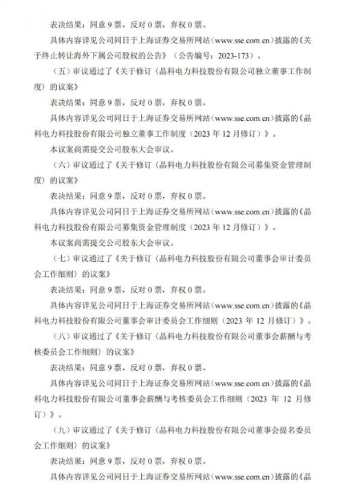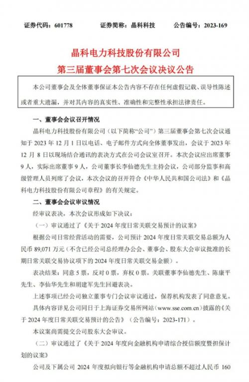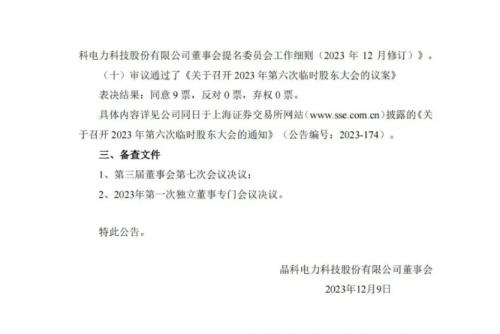 12月9日,晶科电力科技股份有限公司发布《第三届董事会第七次会议决议公告》,审议通过了《关于授权公司管理层办理户用光伏发电系统资产出售的议案》。